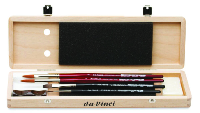 The Blick Exclusive Da Vinci Casaneo and Cosmo- top Spin Synthetic Brushes Wood Box Set is made from top-quality birch wood and includes a variety of watercolor brushes. $75 at dickblick.com.