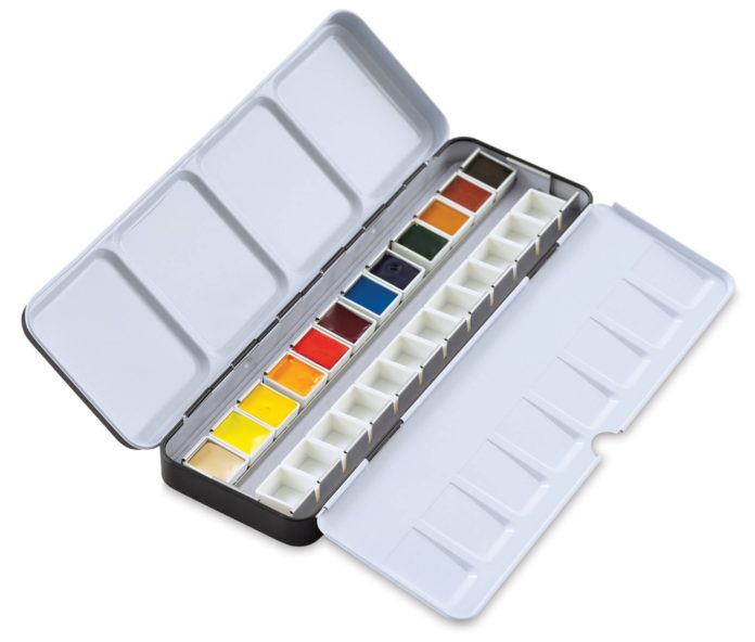 The Daniel Smith Watercolor Half Pan Set contains cool and warm primary colors, a secondary green, and four earth colors, with 12 empty half pans to add your own colors. Priced at $66.05 at dickblick.com.