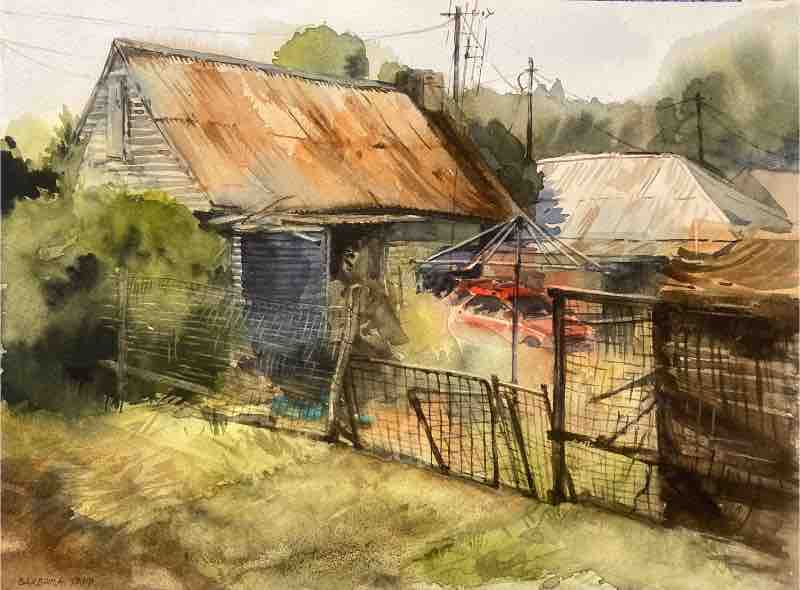 In Behind Broken Fences, Sofala, NSW, we see the back of a weathered house with a tin roof and makeshift fence. An old car sits half-hidden by foliage. “This was an old gold-mining town,” Tapp explains. “For me, the painting tells a story about the ruggedness and tenacity of Australians. They built homes with simple materials, and you see how everything — like the galvanized water tank and Hills Hoist clothesline — is essential and perfectly suited to the climate.”
