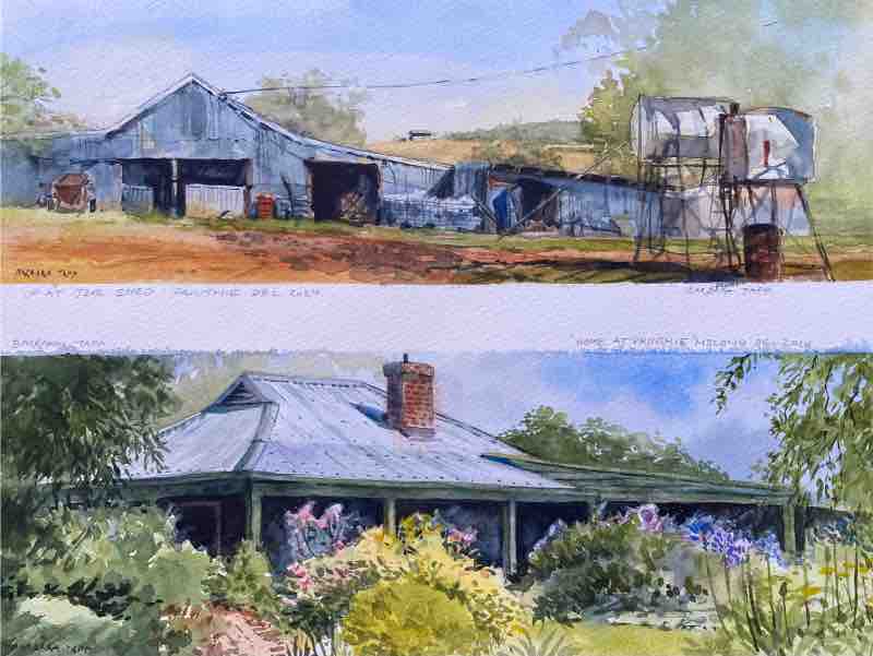 That sensibility runs through the works she created in Australia. Though she was surrounded by breathtaking scenery, her focus remained on the human presence within it. “My impressions of the landscape started forming right away,” she says, “beginning with the proportions of old Australian houses. The steep, corrugated iron roofs; high ceilings; and deep sheltered verandahs help manage climate extremes.”