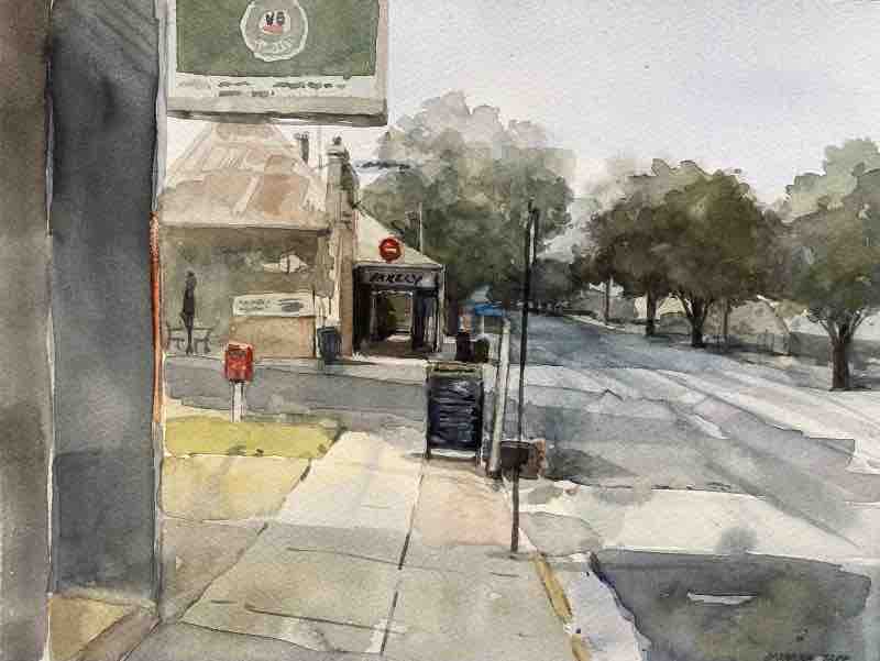 Tapp explores similar territory in The Verandah Fridge, where a refrigerator stands on the porch of an aging home and neat plastic trash bins line up in the otherwise overgrown yard. “Sometimes I shift elements around,” she says. “In this one, I moved the posts near the front door closer together to better suit the composition; they would never be built that way.” That blend of observed detail and compositional intent defines Tapp’s work. Her training as an architectural illustrator helps her anchor these scenes in solid perspective and finely judged angles, while her painter’s eye introduces expressive looseness in foliage and atmosphere.