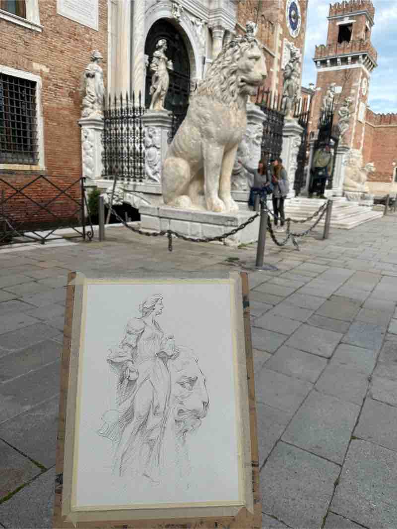 As part of her exploration of a subject, the artist is not afraid to reimagine a composition. In the case of a group of old statues she encountered at the entrance of the Venetian Arsenal, she says: “Even though the lion is dominant, I liked the female statue because I could see her much better framed by the dark door. But the sculpted figure by herself wasn’t balanced, so I added the lion behind her. When we’re on location, we don’t need to copy exactly what we see. We can edit out things we don’t want, borrow things from another location, or even rearrange the composition altogether.”