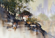 “Watercolor is alive,” says Brazilian watercolorist Eudes Correia. “It works in harmony with the artist. You take one step, it takes two. Watercolor is versatile, dynamic, dries quickly, and is easy to clean. If you carry a small case, two brushes, a pad of paper, and water, anywhere can become your studio: a café, a restaurant, an airplane seat, an airport. There are no limits. You can register an interesting place in a few minutes.